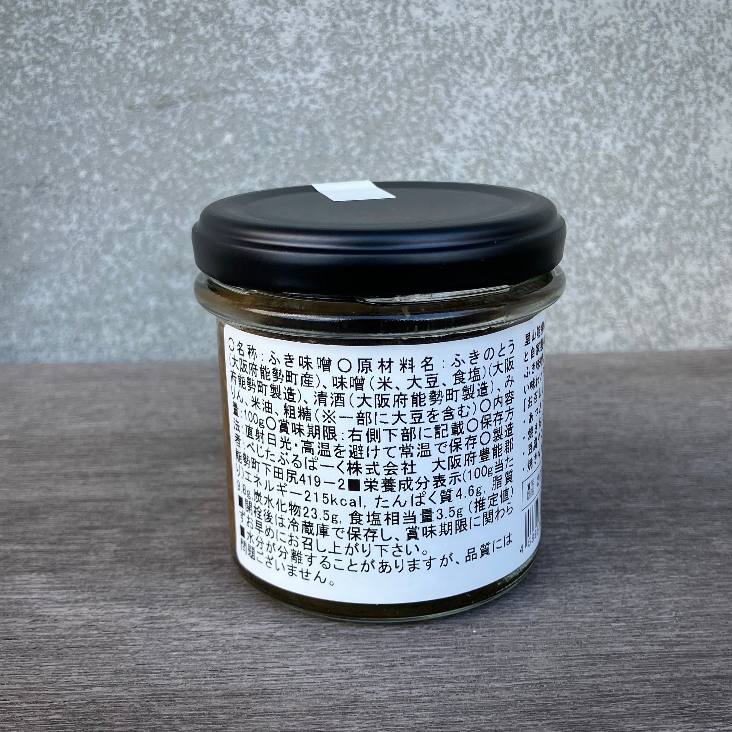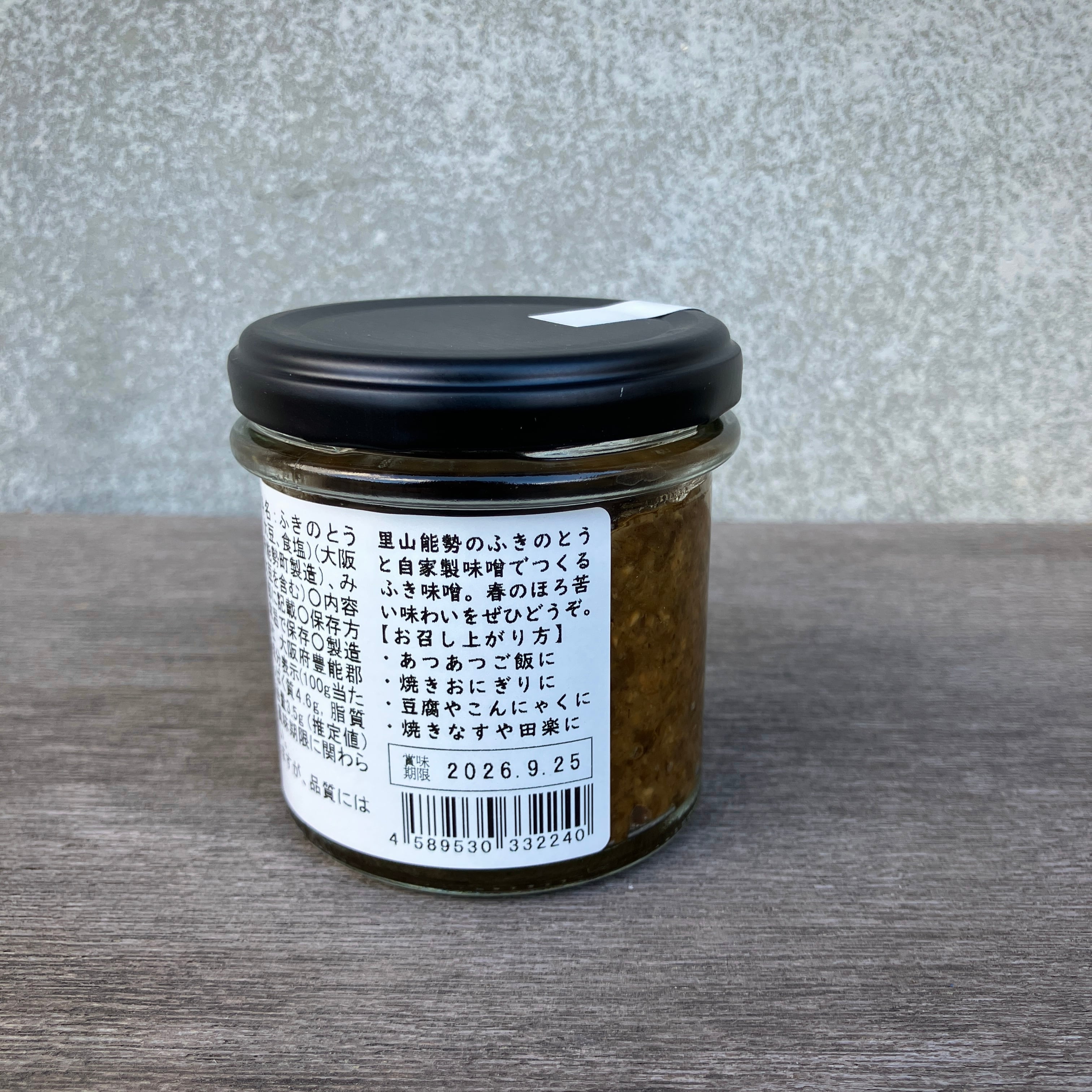 ○名称:ふき味噌○原材料名:ふきのとう(大阪府能勢町産)、味噌(米、大豆、食塩)(大阪府能勢町製造)、清酒(大阪府能勢町製造)、みりん、米油、粗糖(※一部に大豆を含む)○内容量:100g○賞味期限:右側下部に記載○保存方法:直射日光・高温を避けて常温で保存○製造者:べじたぶるぱーく株式会社 大阪府豊能郡能勢町下田尻419-2■栄養成分表示(100g当たり)エネルギー215kcal, たんぱく質4.6g, 脂質9.8g,炭水化物23.5g, 食塩相当量3.5g (推定値)